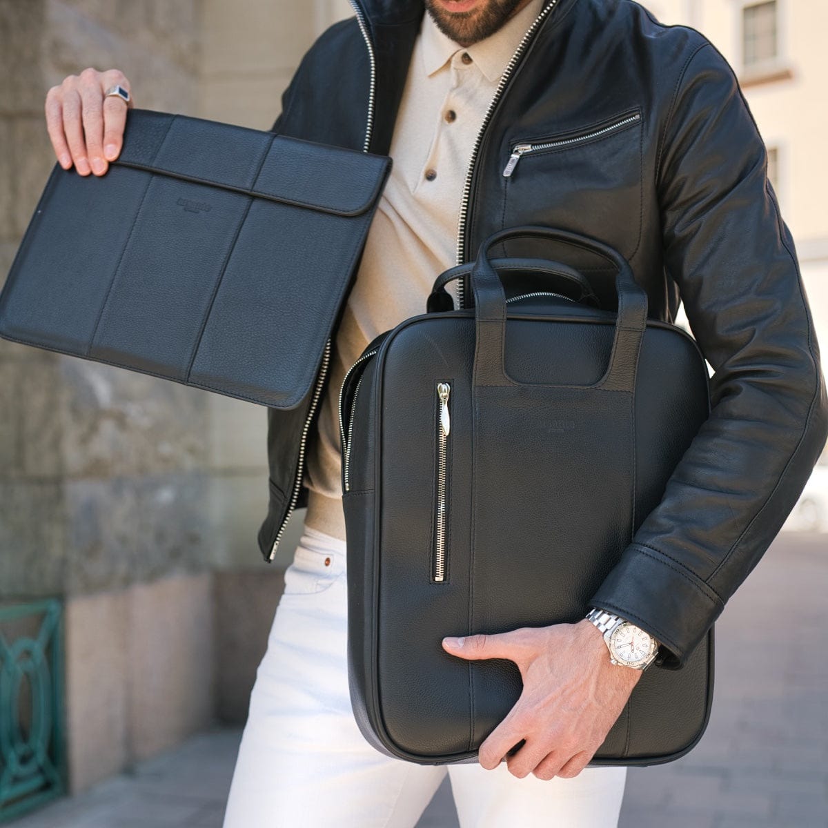 Immerse yourself in unmatched sophistication with the Arsante Sleeve in rich black, the zenith of laptop sleeves. Each piece is handcrafted with the most exquisite full-grain leather, providing stylish protection and a lasting emblem of grace for your laptop. Its elegant, slim profile is effortlessly transportable, while the secure magnetic closure ensures maximum protection for your device. The luxuriously crafted interior nestles your laptop, safeguarding it against scratches and fostering a sense of calm during your travels. Capturing the spirit of timeless Scandinavian design, the Arsante Sleeve in rich black combines lavish elegance with practicality, establishing itself as a vital accessory for the refined individual.